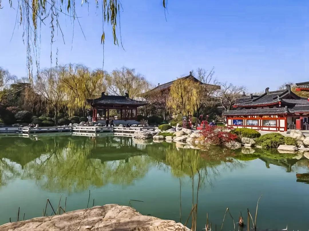 《华清一角》中,华清池的园林景致如诗铺展,朱红古建与碧绿池水相映成趣,垂柳轻拂间勾勒出唐风雅韵。澄澈蓝天作底,山石草木点缀其间,水面倒影将古建与自然相融,尽显华清胜境的静谧雅致。